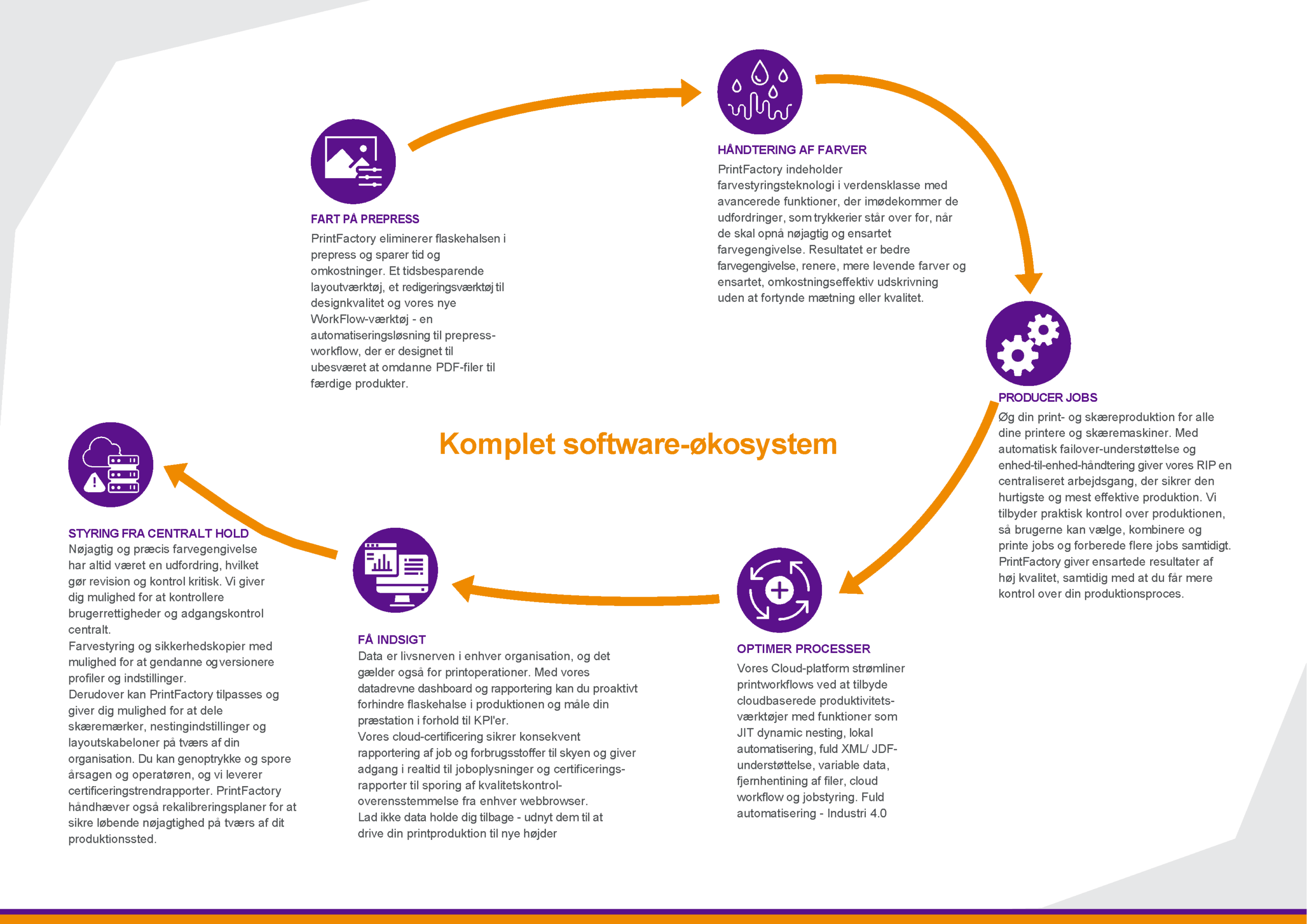 PrintFactorys software-økosystem styrer ALLE dine printere og skæremaskiner – uanset mærke, størrelse eller alder – via én central APP.